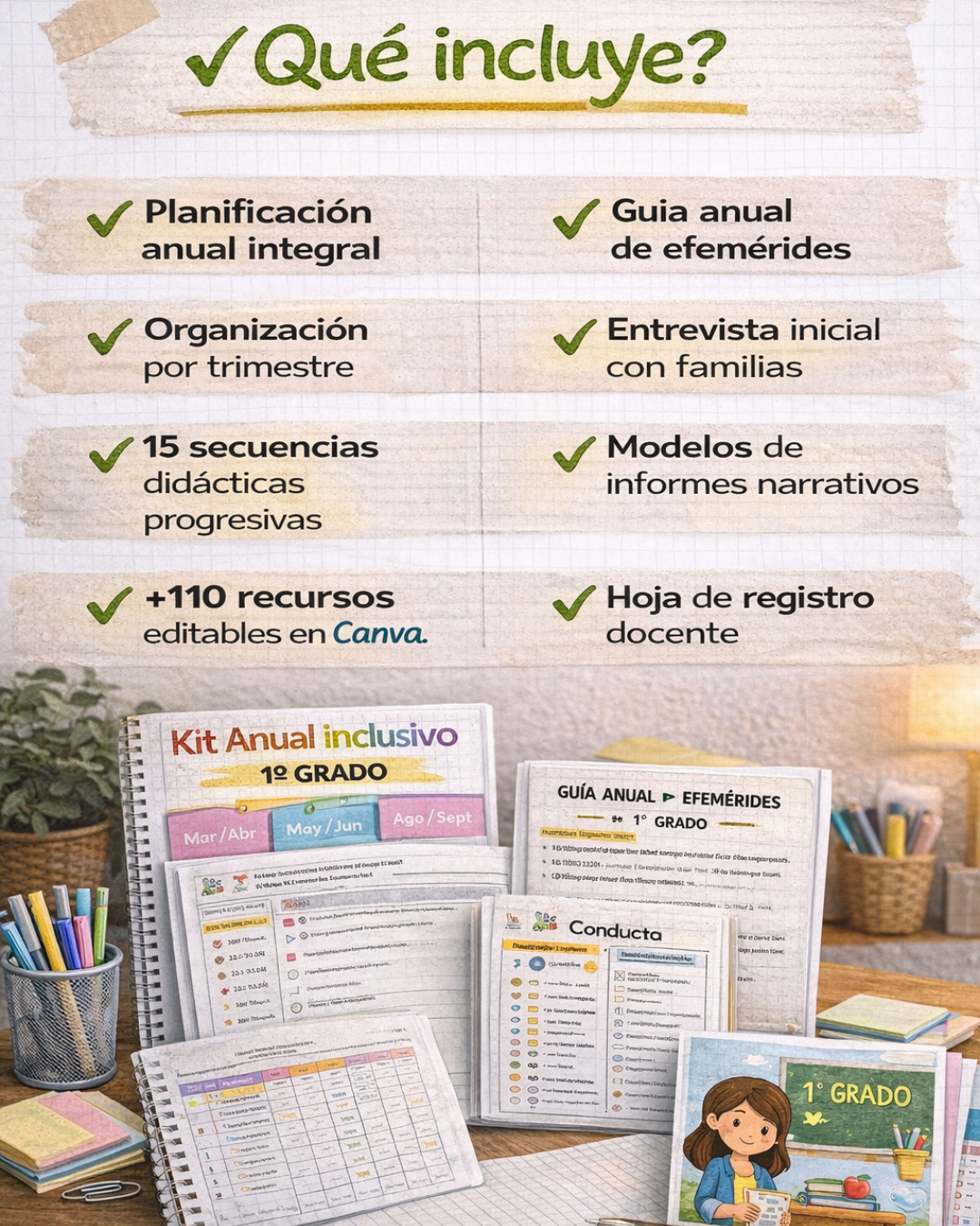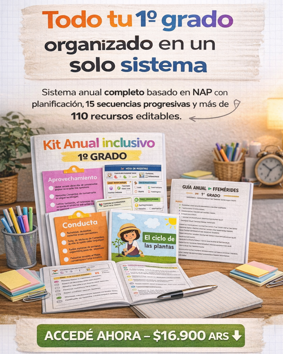 Sistema anual completo para 1° grado basado en NAP. Incluye planificación anual integral, 15 secuencias didácticas progresivas, guía de efemérides, modelos de entrevista e informes y más de 110 recursos editables para organizar todo tu año escolar.